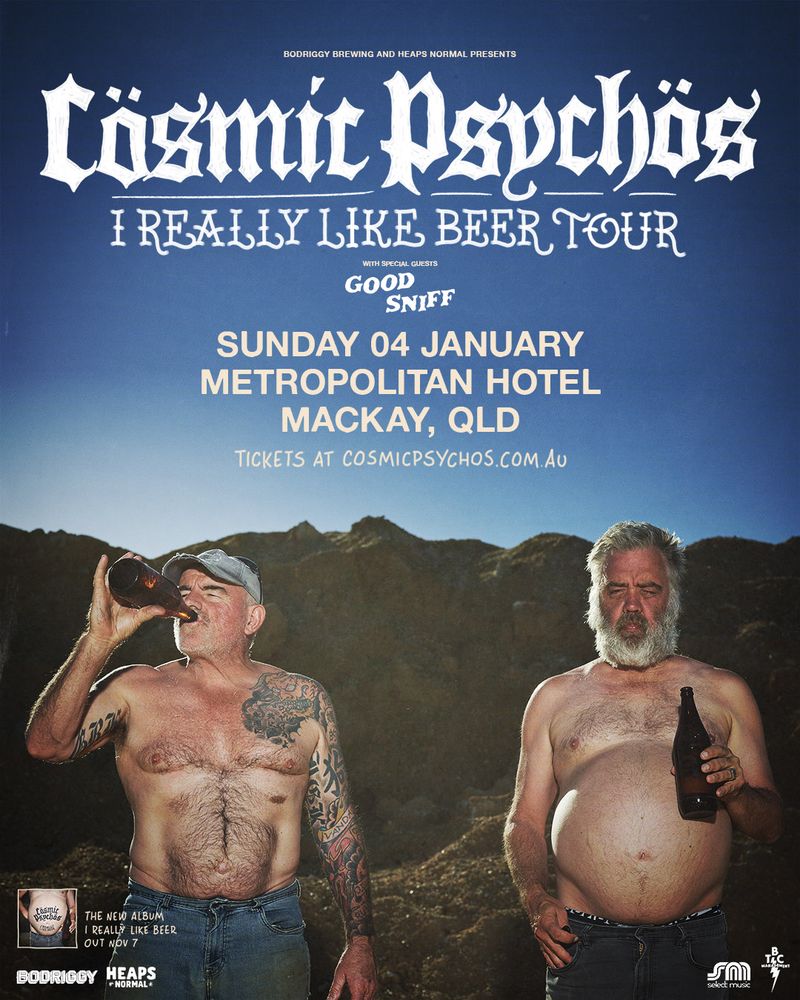 Sunday 04 January | Metropolitan Hotel, MackayAustralias favourite beer-fuelled legends Cosmic Psychos are back with their twelfth studio album I Really Like Beer on Friday November 7, and theyre hitting the road the very same day. No mucking around. To mark the album release, the band is heading off on their most ridiculous tour yet. 42 regional dates right across Australia, kicking off in early November and charging into 2025. RSLs, pubs, halls and hard-earned beers with the local townsfolk. The band will be joined on drums by none other than Dan Peters (Mudhoney, Nirvana) for the first leg and that young whippersnapper BC from Dune Rats on the second stretch. One tour. Two drummers. No downtime. We dare you to find a more extensive tour in Aussie Rock history. We made a record about beer, so now were going to play it in as many pubs as possible. Simple. says Knight.Can't make the event? Sell your tickets through our resale partner Tixel!